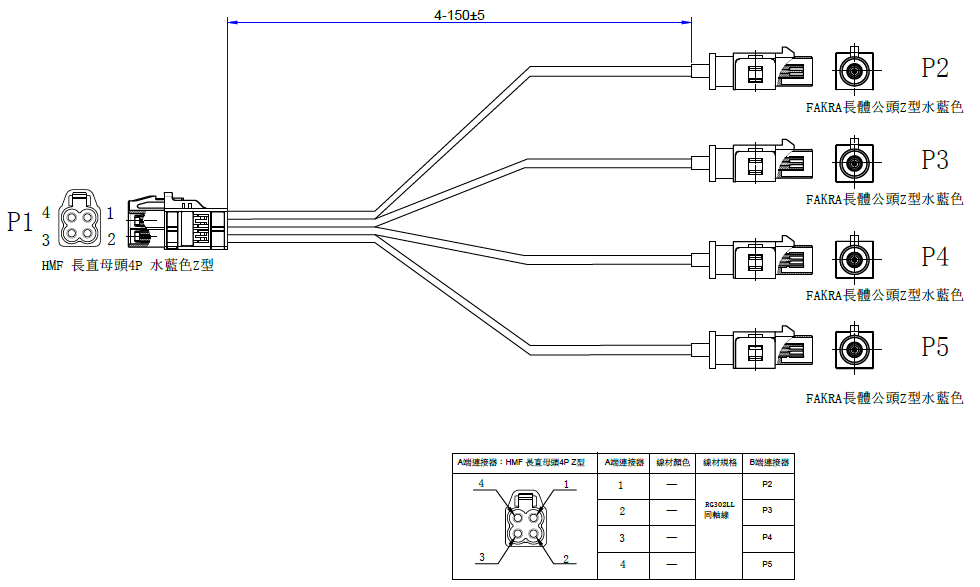 FAKRA A端 : HMF 長直母頭4P Z型 B端 : 長體公頭 Z型 導通阻坑 3.0 ohm Max 高壓測試 AC:750V,0.5mA 0.01ms 絕緣阻抗 DC:500V, 100MΩ ohm MIN 阻抗:50Ω 頻率:DC-3GHz 抗拉强度 110N MIN 符合ROHS 2.0標準